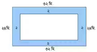 প্রশ্ন ৯ঃ একটি আয়তকার বাগানের দৈর্ঘ্য ৩২ মিটার এবং প্রস্থ ২৪ মিটার। এর ভিতরে চারদিকে ২ মিটার চওড়া একিট রাস্তা আছে। রাস্তাটির ক্ষেত্রফল কত?