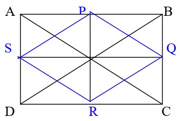 মনে করি, ABCD আয়ত। P, Q, R ও S যথাক্রমে AB, BC, CD ও AD এর মধ্যবিন্দু। P,Q; Q,R; R,S ও S, P যোগ করি। প্রমাণ করতে হবে যে, PQRS একটি রম্বস।